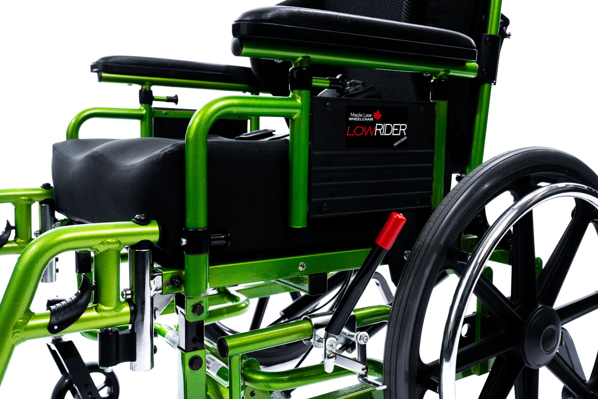 The LowRider wheelchair is our dynamic style tilt chair. Its design includes a front pivot point which allows for minimal seat-to-floor increase as the chair is tilted. This feature will allow the user to foot-propel while enjoying the comfort of up to 300 pressure reliving tilt.
